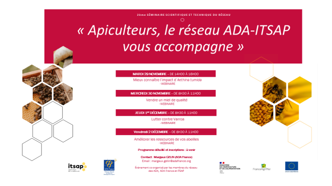 Apiculteurs, apicultrices, le réseau ADA-ISTAP vous accompagne ! Du 29 novembre au 2 décembre 2022, suivez en ligne la 2ème édition du séminaire scientifique et technique, vitrine de nos travaux au service du développement de l’apiculture. Ce séminaire est prévu exclusivement en distanciel. Les accès aux webinaires sont gratuits mais l’inscription est obligatoire du…